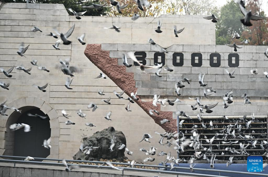 Doves are released during a national memorial ceremony for the Nanjing Massacre victims held at the Memorial Hall of the Victims in Nanjing Massacre by Japanese Invaders in Nanjing, capital of east China's Jiangsu Province, Dec. 13, 2025. The 12th national memorial day was observed in Nanjing on Saturday to honor about 300,000 victims killed by Japanese troops during the Nanjing Massacre, in a year that marks the 80th anniversary of the end of World War II (WWII). (Xinhua/Li Bo)