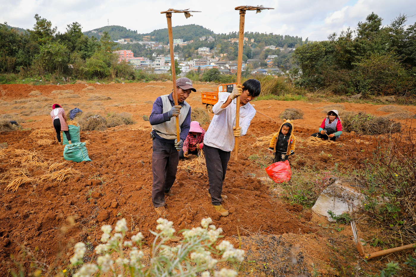 清晨的薄雾尚未散尽,龙海乡雨古村村民郑乔生、朱海民已经开始了一天的劳作。一株株根茎饱满的云南参被小心翼翼地从土中挖出,田垄间堆起小山般的褐色“珍宝”。