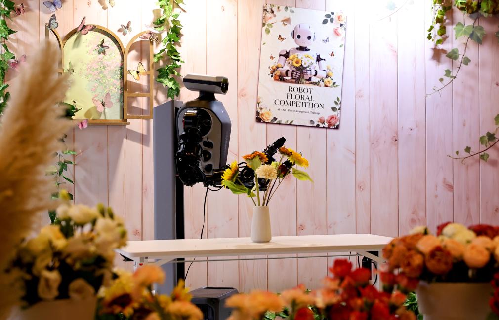 在2025全球开发者先锋大会暨国际具身智能技能大赛上,机器人在插花竞技场内移动。新华社记者 方喆 摄