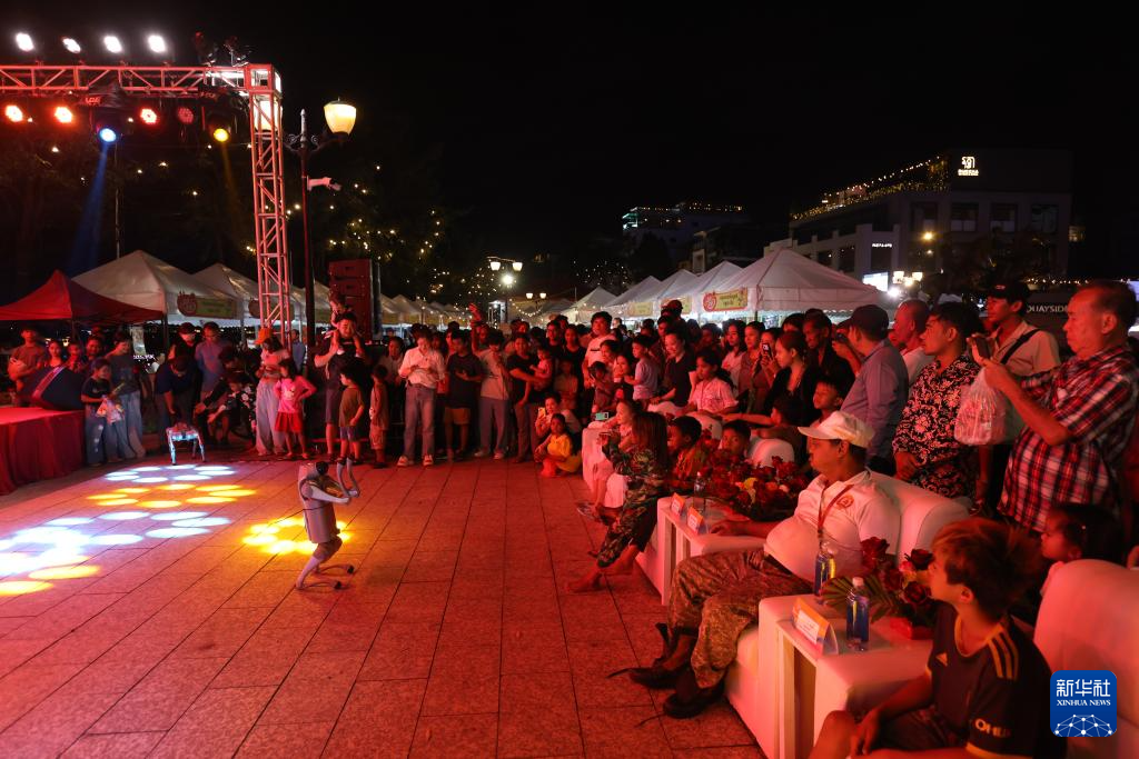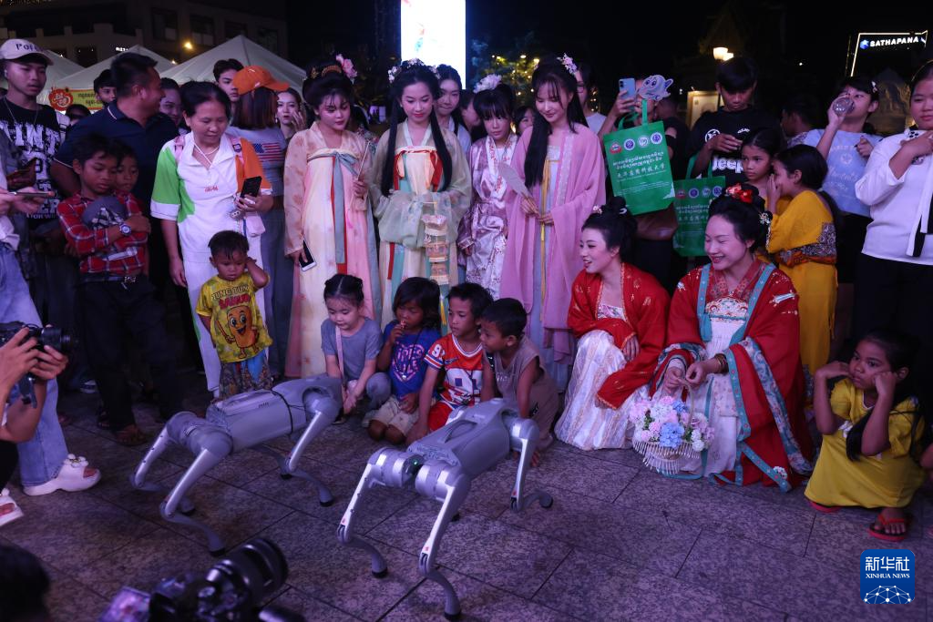 12月14日,在柬埔寨金边,人们在“走读中柬”系列文化活动文化市集上观看机器狗表演。