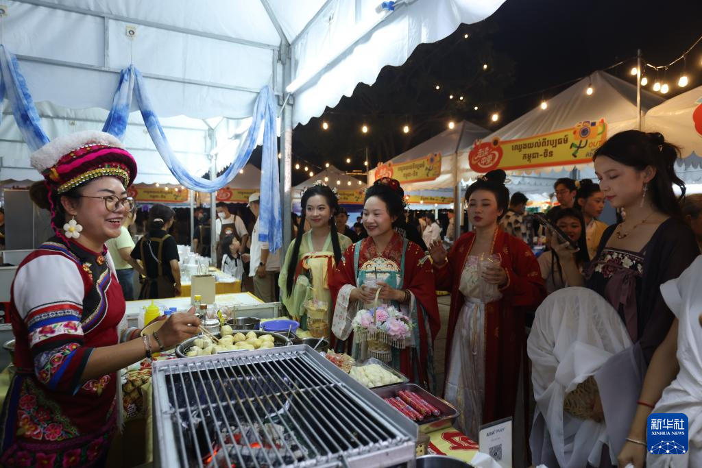 12月14日,在柬埔寨金边,人们在“走读中柬”系列文化活动文化市集上体验中国美食。