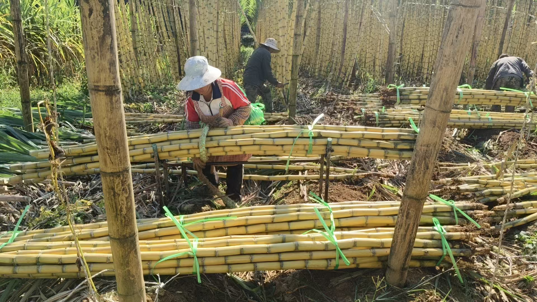 时下,正是甘蔗砍收旺季,走进甘蔗地里,成片的甘蔗在冬日里焕发着勃勃生机,葱翠的叶子在风中摇曳,挺拔葱郁、长势喜人。蔗田里,蔗农们分工明确,有的负责砍削,有的负责打捆,还有的负责搬运……忙得不亦乐乎,呈现一派繁忙的丰收景象。