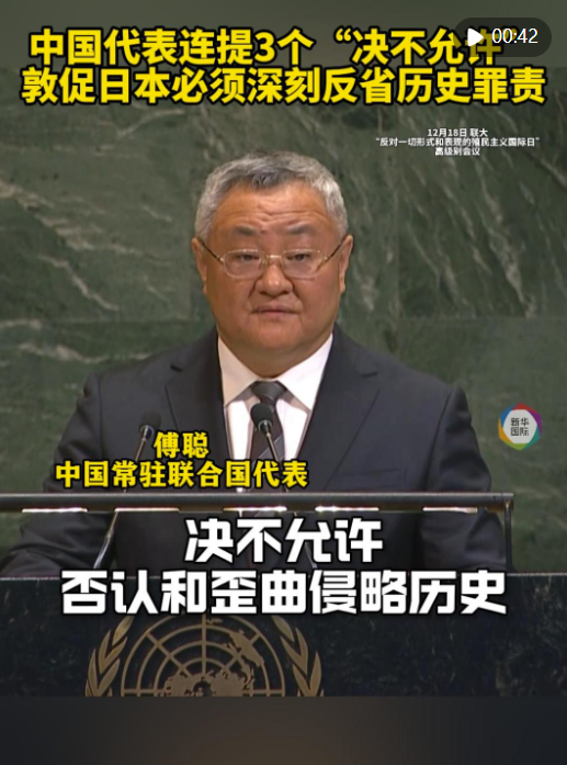 中国常驻联合国代表傅聪18日在联大纪念首个“反对一切形式和表现的殖民主义国际日”高级别会议上发言时表示,世界仍未走出殖民主义的阴影,必须坚决反对一切挑战和妄图颠覆战后国际秩序的言行,日本作为二战战败国,必须深刻反省历史罪责,恪守就台湾问题作出的政治承诺,立即停止挑衅越线,收回错误言论。