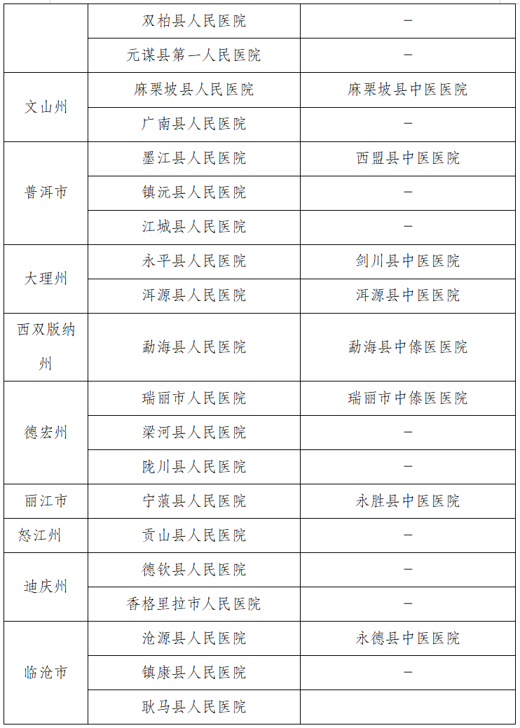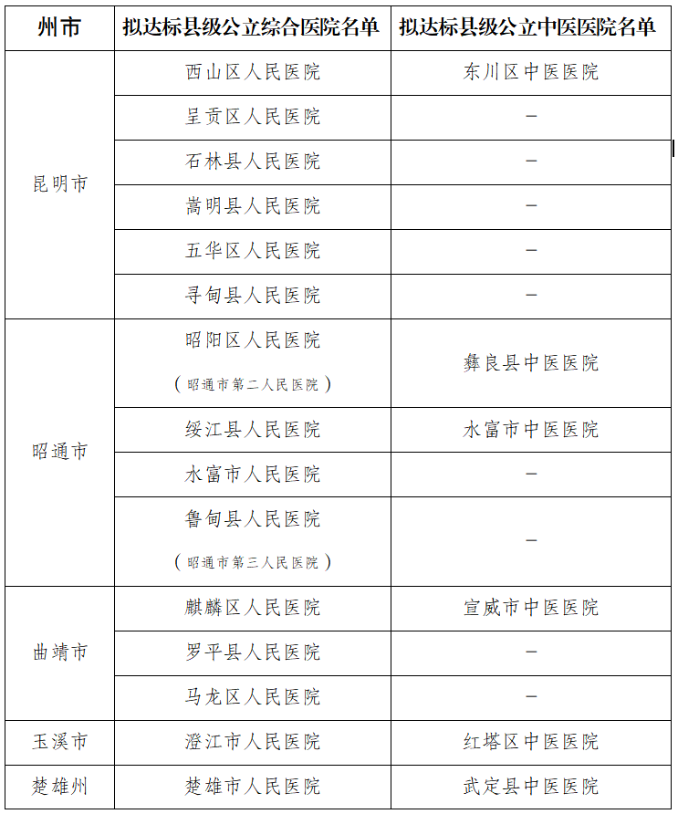 根据《云南省卫生健康事业高质量发展三年行动计划(2023—2025年)》中“多病共治护老人行动”要求,实施县级公立医院老年医学科(老年病科)建设项目。经医院申报、州(市)验收、省级复核,确定麒麟区人民医院等35家县级公立综合医院和东川区中医医院等14家县级公立中医医院为2025年度拟达标医院,晋宁区中医医院等5家已独立设置老年病科的县级公立中医医院为拟续建医院。