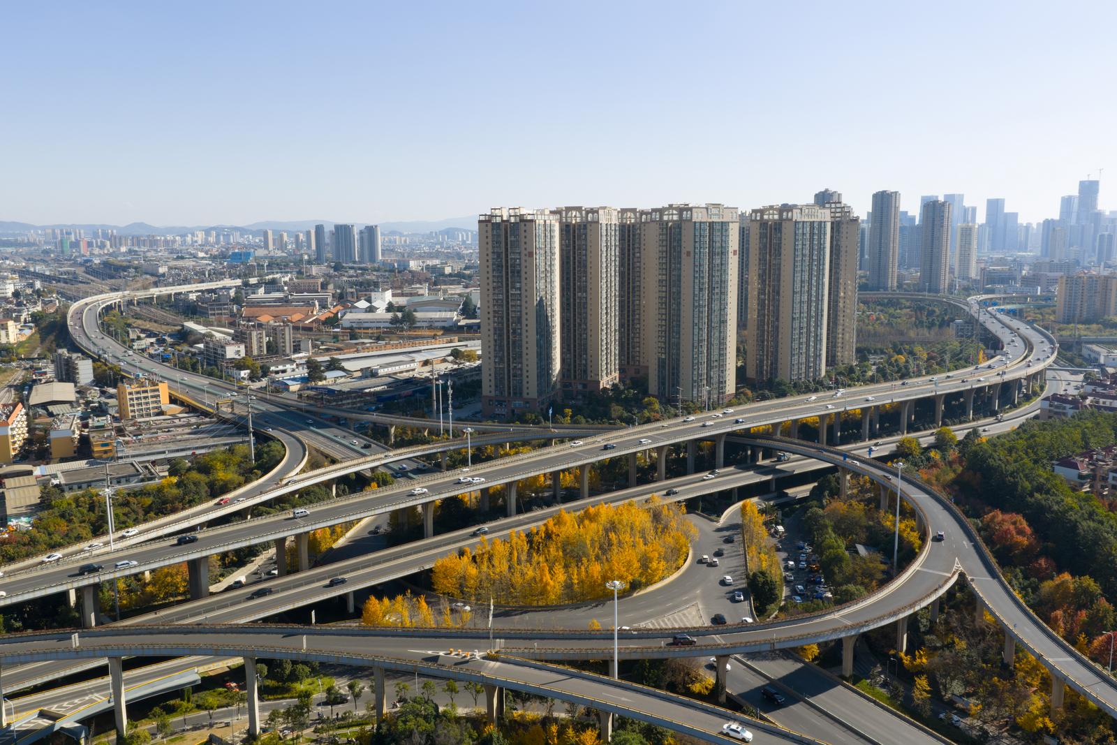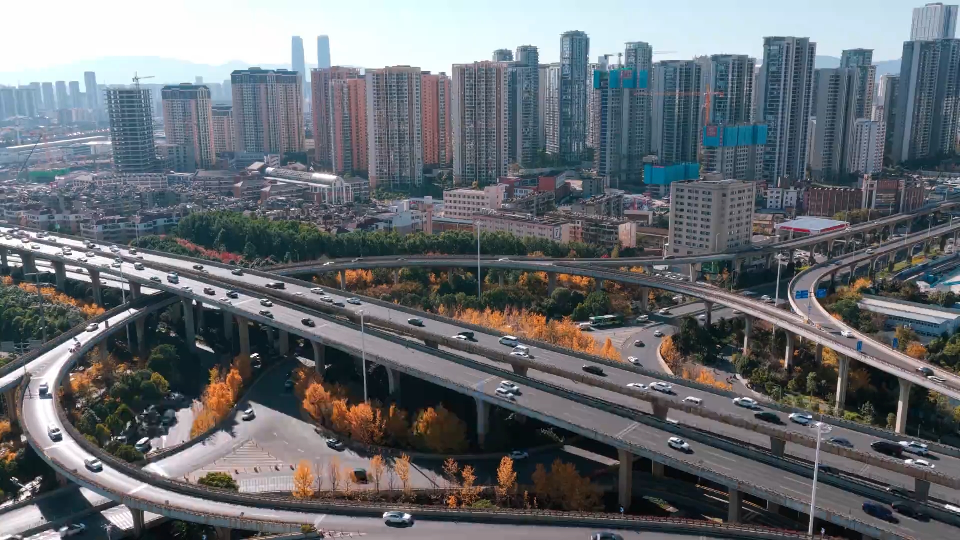 冬日里的昆明菊华立交,被大自然渲染成一幅流动的油画。片片银杏如同织就的金黄绸缎,沿着桥体蜿蜒铺展,宛若为城市佩上一串光华流转的项链。其间点缀着点点枫红,似霞光碎落,与灿灿金黄交织成一首温暖的诗。