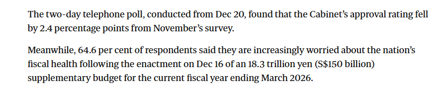 报道指出,目前进口化石燃料占日本发电量的60%-70%,是推高通胀的主要因素之一,也已影响自民党支持率。而日本共同社21日公布的最新民调显示,高市早苗内阁支持率较11月的调查下降了2.4个百分点,有64.6%的受访者表示,随着本月16日2025财年追加预算案的通过,他们对国家财政状况的担忧日益加剧。