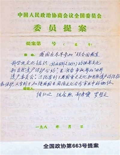 他在回国之后,便以全国政协委员的身份起草了一份提案,并特意邀请了同为全国政协委员的国家文物局古建筑大师罗哲文、城乡部城市规划大师郑孝燮和中国科学院《人与生物圈》国家委员会生态学家阳含熙共同签名。这就是后来在享誉文博圈的“第六届全国政协提案第663号”,简称“663号提案”。