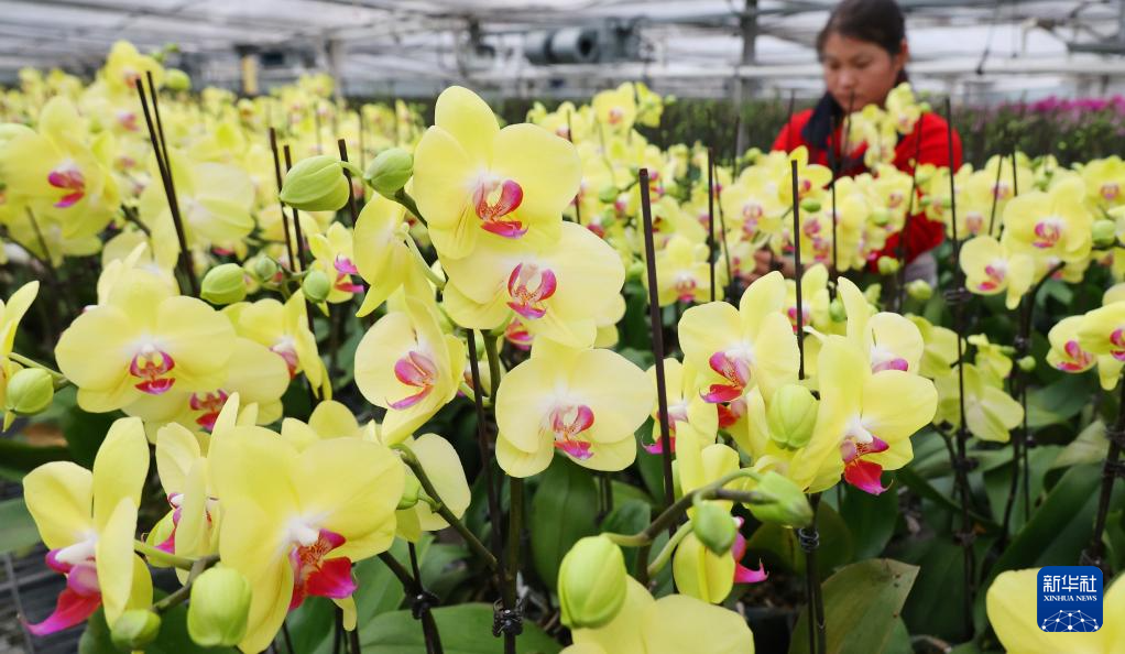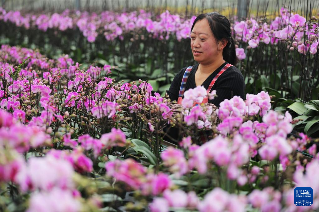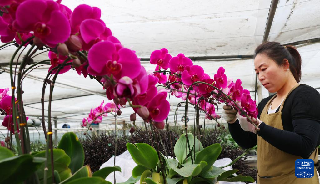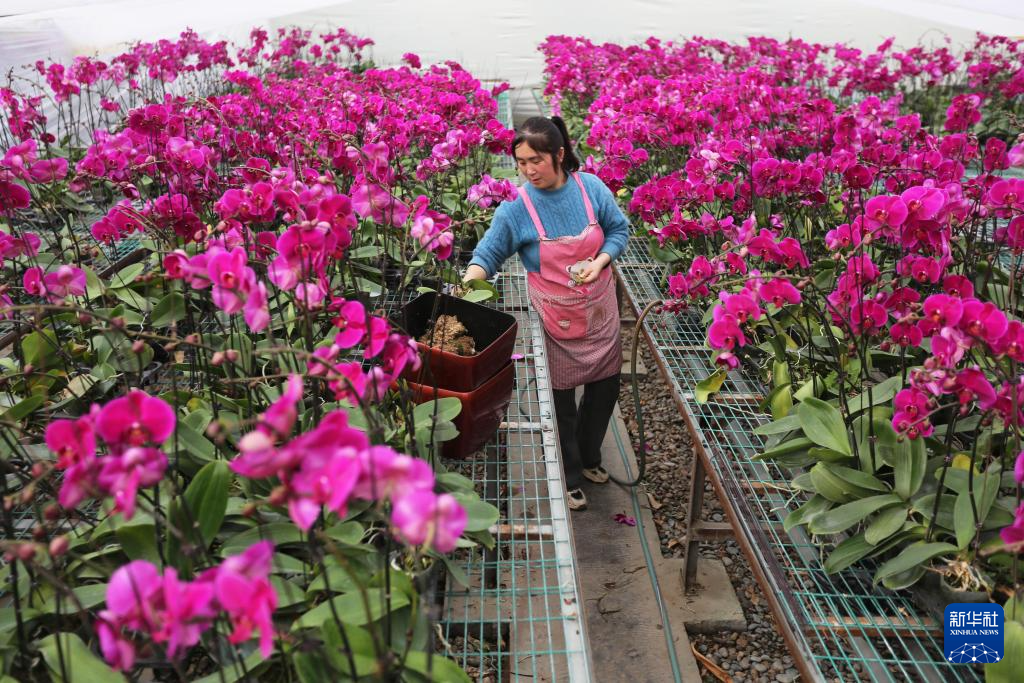 12月23日,在江苏省连云港市农商控股集团农业科技公司花卉大棚,工作人员对蝴蝶兰进行组盆。新华社发(耿玉和摄)