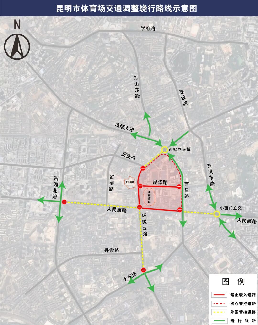 赛事期间,将根据现场交通情况,视情况对昆明市体育场周边的昆华路、环城西路、人民西路等道路采取临时性交通调整措施。