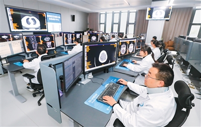 图为10月30日,江苏省淮安市第五人民医院医生在影像阅片中心读片出报告。近年来,淮安市淮阴区将市区两级医疗优质资源下沉18个乡镇的189个村卫生室,实现“基层检查、上级诊断”。通过双向转诊与远程会诊,减少患者重复检查,降低就诊费用,今年以来完成远程诊断报告审核2.7万余份。
