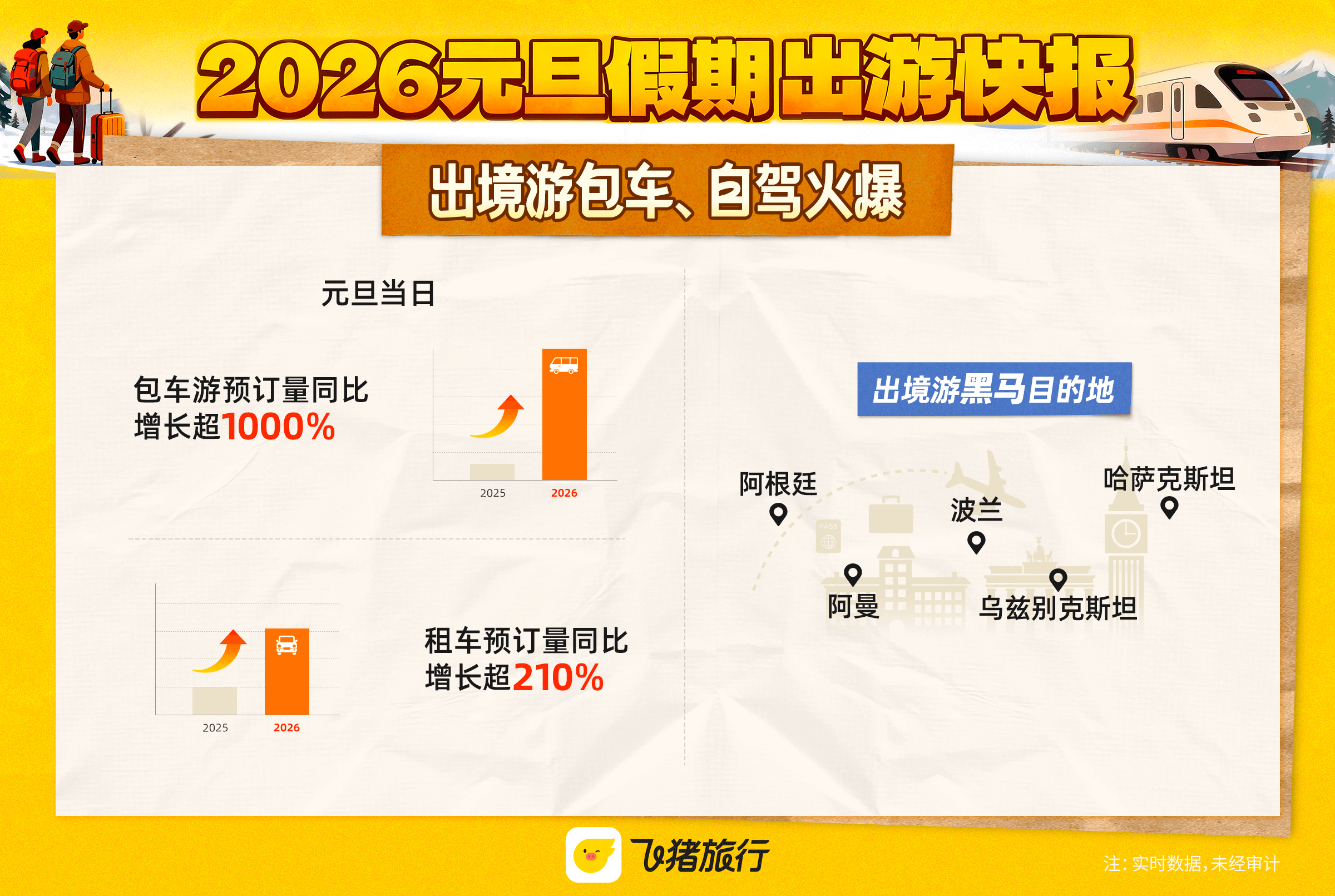 出境游方面,兼具自由度与舒适性的玩法热度高涨。飞猪数据显示,元旦当日,包车游预订量同比去年增长超10倍,租车预订量同比增长超210%。