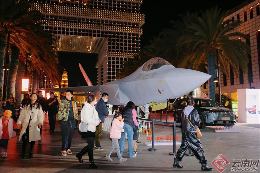 市民游客在公园1903商业广场“科技·智行·国之重器——红旗天工X歼35”主题巡展参观。