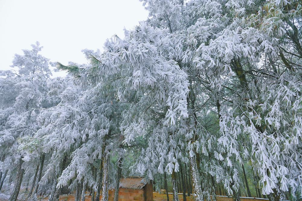 1月6日,受寒潮天气影响,寻甸回族彝族自治县六哨乡出现大面积雾凇景观。横河、柏栎等高海拔村寨银装素裹,草木凝霜挂雪,宛如仙境。雾凇出现需同时具备低温和水汽条件,六哨乡海拔较高,冬季湿润寒冷,是雾凇易形成区域。(云南日报 记者张雁群/摄)