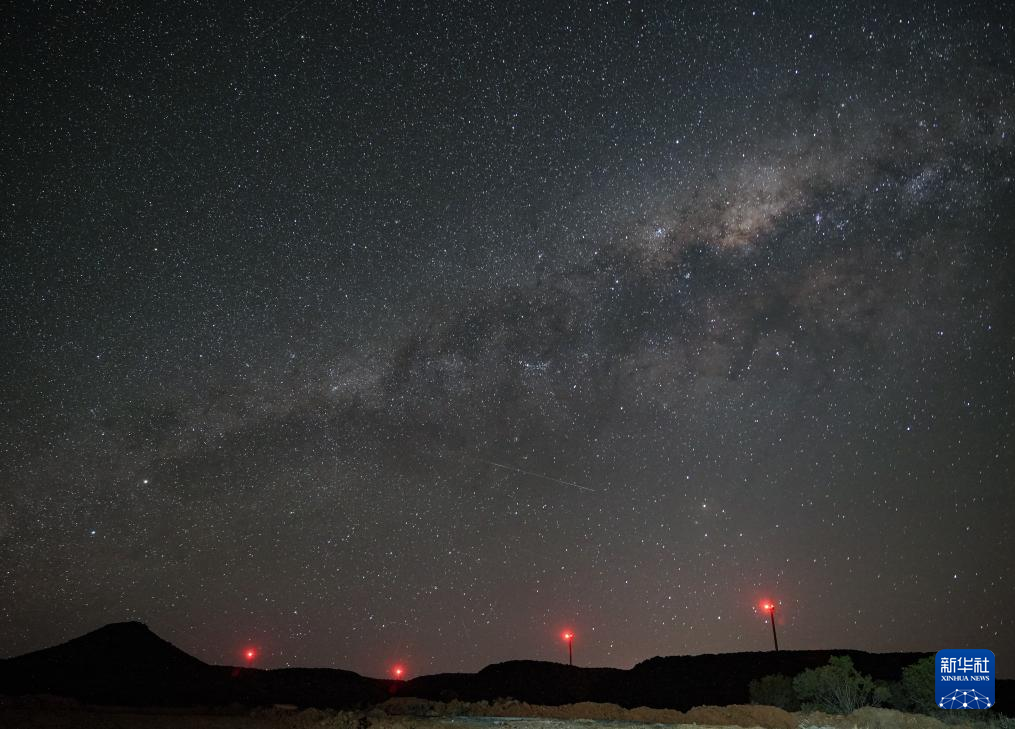 2025年10月22日,在南非北开普省德阿镇,德阿风电项目的风机在星空下运转。新华社记者韩旭摄