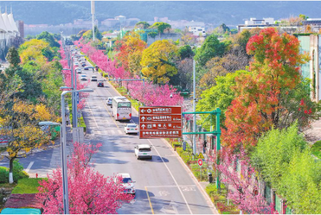深冬时节,昆明红塔西路迎来浪漫的“樱花雪”,1.9公里长的道路两旁,600余株冬樱花竞相盛放,粉红云霞一直蔓延至滇池畔,层层叠叠的冬樱花与湛蓝晴空交相辉映,勾勒出春城独有的冬日画卷。(记者胡妤雅/摄)