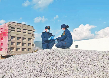 海关关员在畹町口岸对进口缅甸碎石开展现场查验。 本报通讯员 尹剑飞 摄