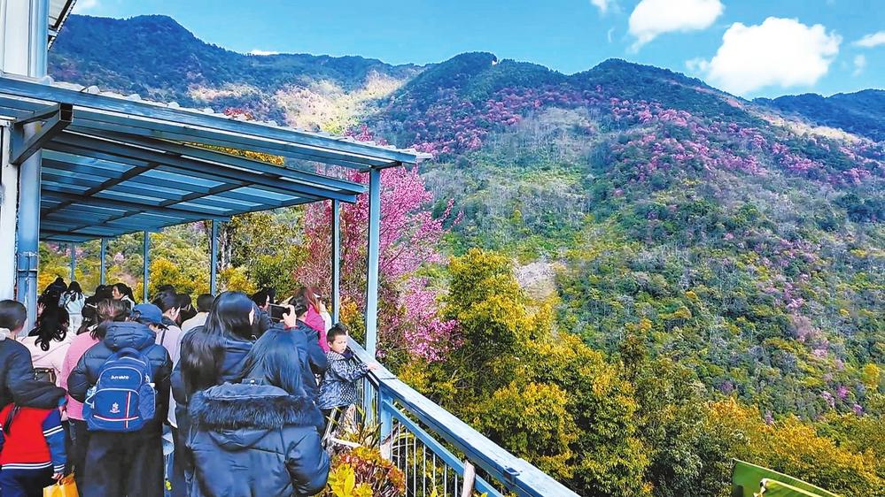 近日,施甸县善洲林场东麓的十万余株野生冬樱花进入盛放期,漫山遍野的粉白花朵如云似霞,吸引众多游客前来观赏打卡。
