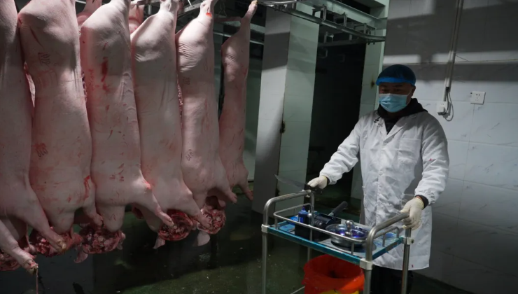 凌晨1点,屠宰车间内灯火通明,生猪的嘶叫声与机械运转声交织成独特的“夜曲”。