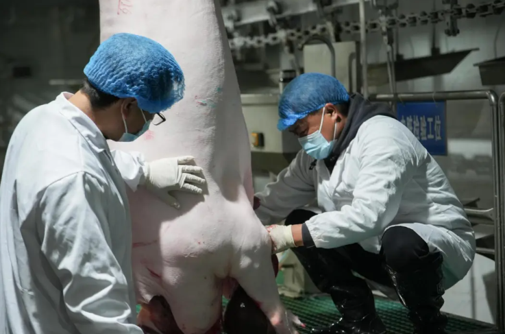 “用手按一下肉,看它的弹性,观察皮肤颜色变化,基本上就能判定猪有没有生病、生什么病。”李丽权说。从生猪入场到检疫出证,整个流程涵盖监督查验、检疫申报、宰前检查、同步检疫、结果处理等多个环节,需检测口蹄疫、猪瘟、非洲猪瘟等十多种疾病。他严格按照操作规程,对每一头生猪实施“头头检疫、件件必检”。