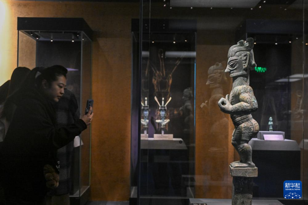 1月18日,观众参观展出的青铜着裙立人像。新华社记者 金良快 摄