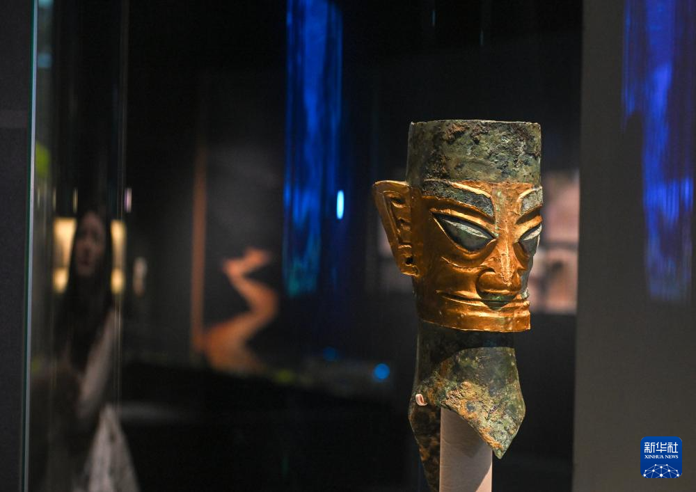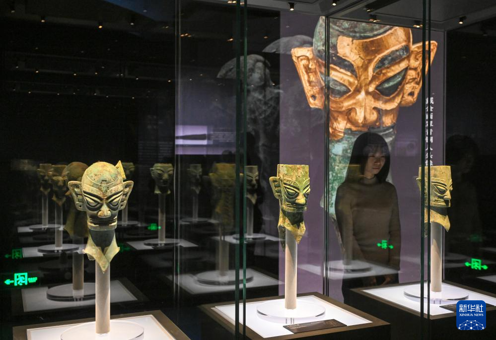 这是展出的戴金面罩青铜人头像(1月18日摄)。新华社记者 金良快 摄