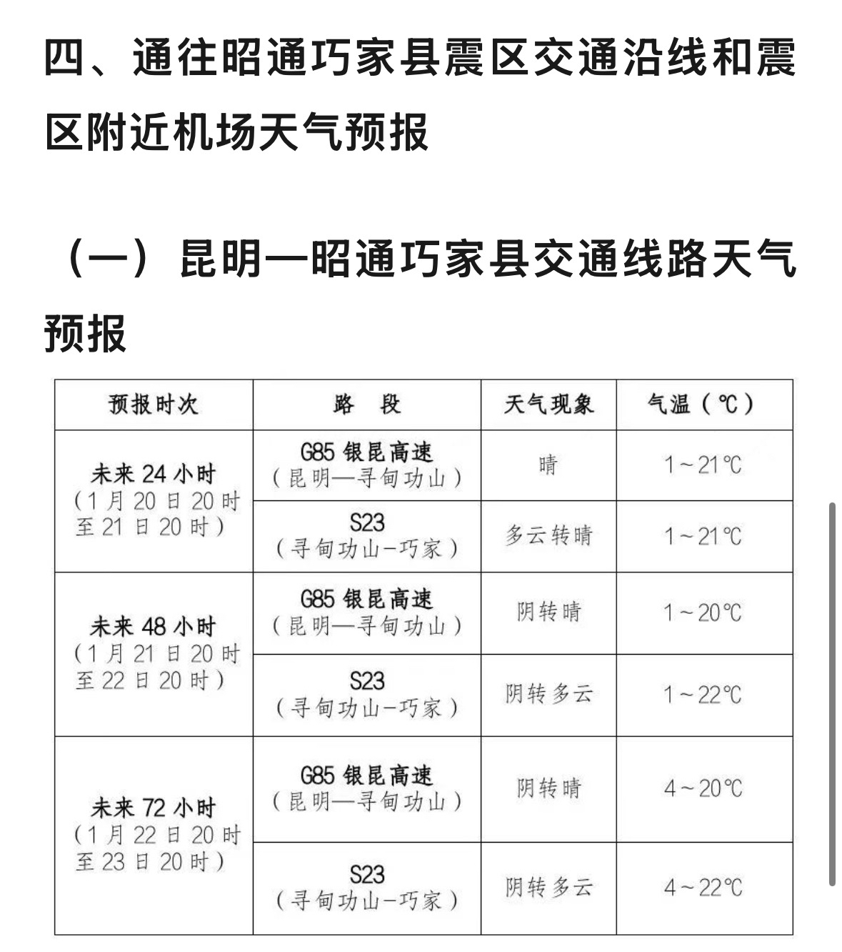 预计未来两天,冷空气继续维持在云南东部边缘,降雨也集中在昭通市、曲靖市南部、文山州、红河州,降雨量虽不大,但昭通市巧家县刚经历过地震,昆明至震区路段以晴到多云为主,无明显降水出现,天气总体上有利于救援车辆及社会车辆进出震区,但早晚气温低,局地路段清晨有雾,局部高海拔路段道路结冰,请注意防寒保暖和行车安全。