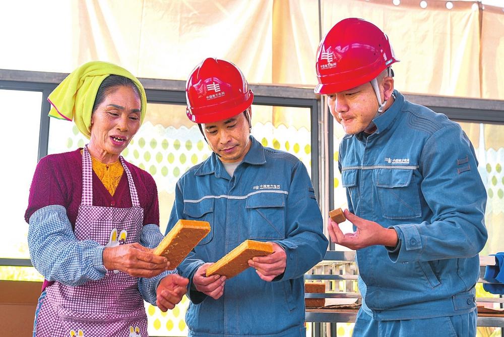 村民向供电人员介绍古法制红糖工艺。 李时晖 摄