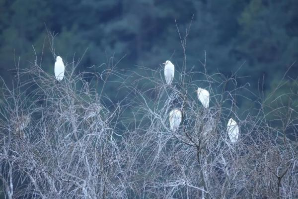 倘若你用清脆的嗓音向它们致意,白鹭便会应声而起,成群结队飞向天际。暮色渐浓,先是几只倦了的白鹭率先归巢,栖于树梢,静静眺望远方,等候同伴归来。