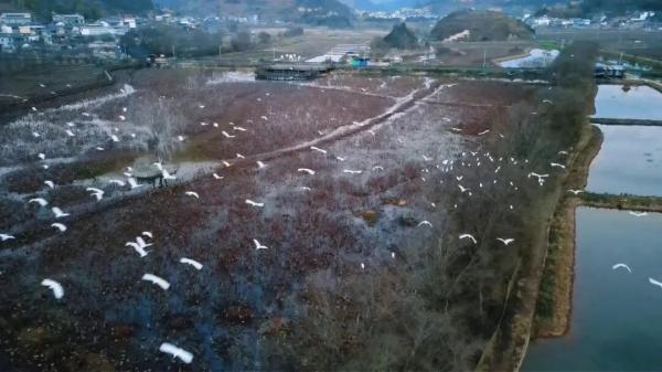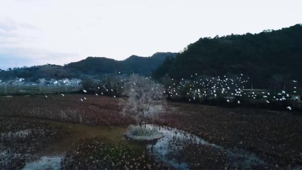 夕阳西下,冬日的野鸭湖里枯荷静立,安静地陪伴着村庄、田舍、虾塘,远远望去,犹如一幅绝美的油画。走近野鸭湖,只见湿地精灵白鹭们三五成群在休息,偶尔会有一行白鹭悠然划过。