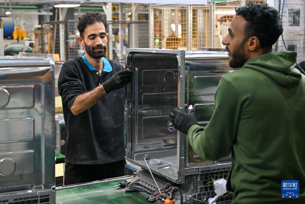 1月19日,在埃及苏赫奈泉的中埃·泰达苏伊士经贸合作区,埃及员工在美的埃及厨房和热水器有限公司洗碗机生产车间组装洗碗机。新华社记者 辛梦晨 摄