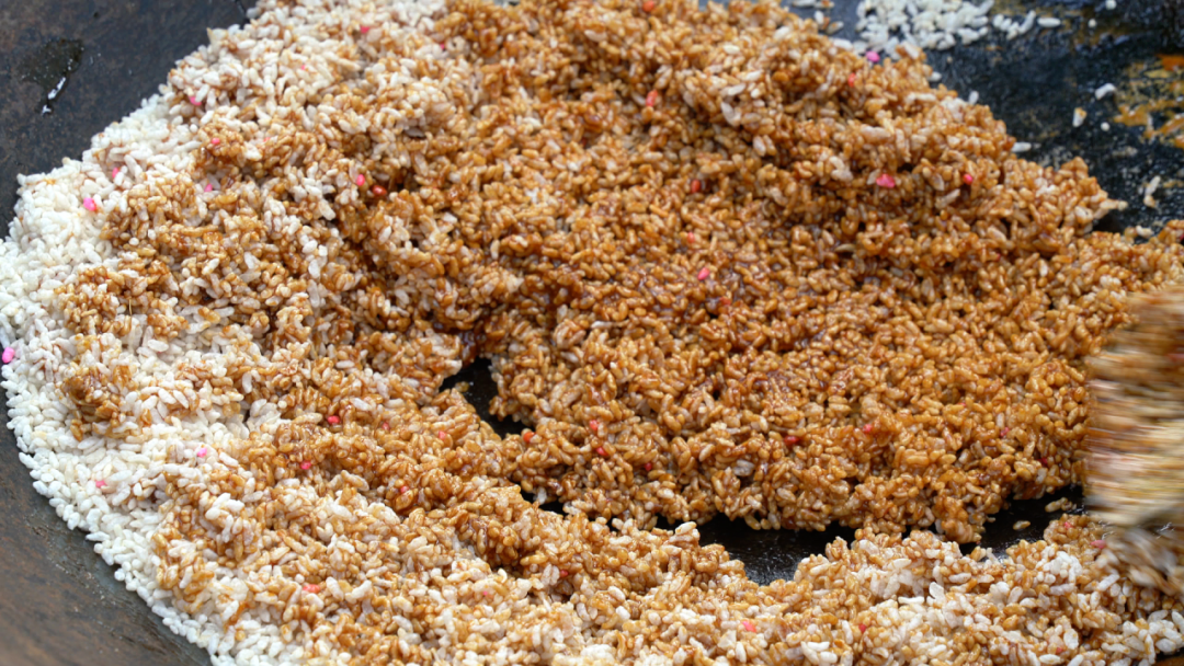 另一边,新榨的红糖块被投入锅中,然后加水慢熬,并不停搅拌,直至糖块完全融化,熬煮出浓稠起泡、色泽红亮的糖浆。这时把滚烫的红糖水趁热浇入炒好的米花中,锅铲翻飞间,糖浆与米花充分交融,每一粒米花都裹满甜香。大家迅速将拌匀的食材压实定型,待其冷却变硬后,用刀划切成大小均匀的方块,一块块香甜软糯的富宁米花就新鲜出炉了!