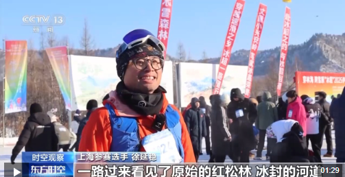 上海参赛选手徐延稳:第一次来东北体验冰雪越野,感觉太爽了,一路过来看见了原始的红松林、冰封的河道,这是以前从来没有见到过的,我们拍了很多照片给家人看,让他们看看东北的冬天有多美。
