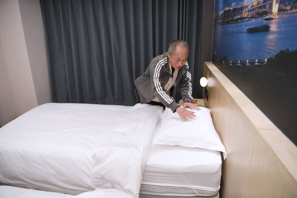 2025年11月28日,宏福苑居民邝佩麟在粤海酒店“爱心客房”里整理床铺。新华社记者陈铎 摄