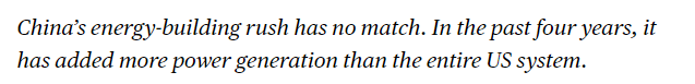 文章说,中国的能源建设速度无与伦比。过去四年,中国新增的发电容量超过了整个美国电力系统的总和。这种大规模能源基础设施投资帮助中国降低对化石燃料依赖,为人工智能数据中心等高耗能技术提供稳定电力供应,从而在全球科技竞争中获得显著优势。