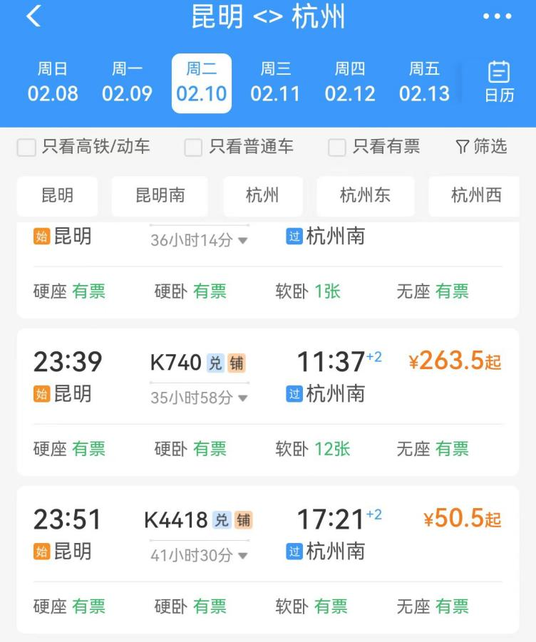 昆明信息港讯 实习记者于沛冉 春运期间,前往一二线城市的“反向出行”正成为越来越多人的性价比之选。记者从铁路12306官网获悉,自2月10日至2月12日,昆明至杭州的K4906和K4418两班特快列车,全程票价仅需50.5元,相当于原价263.5元的不到两折。