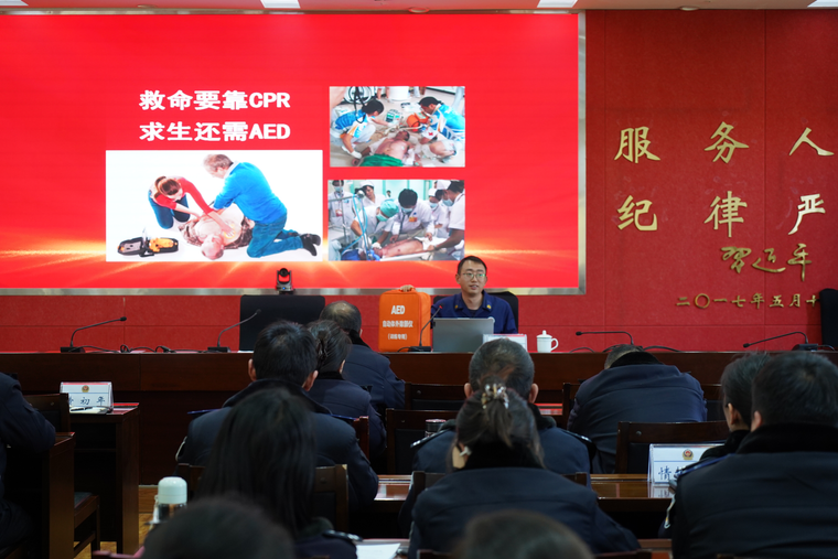 “普通的云梯车一般只能升到50米左右。”“浓烟是火场的第一杀手。不能盲目穿越浓烟和火场。”“记住!不管在几楼,都不提倡大家盲目跳楼。”针对高层建筑火灾特点,消防宣传员讲解了科学逃生方法:火灾初期火小烟小时,需快速选择最近安全出口撤离;若楼层较高、火势蔓延无法逃生,应退回屋内关闭门窗,用湿毛巾封堵门缝防烟火入侵,通过挥舞亮色衣物、窗口呼救等方式暴露位置等待救援。同时,消防宣传员提醒大家,去到陌生场所,一定要先观察附近安全出口的位置,注意该安全出口是否被锁住。要懂得所处场所火灾危险性,做到“会灭火、会疏散、会逃生”,有备无患。理论课程最后,消防宣传员针对环食药侦支队单位的急救器材配备情况对自动体外除颤器(AED)使用方法进行了详细的教学,让参训人员能够从容应对紧急情况的发生。