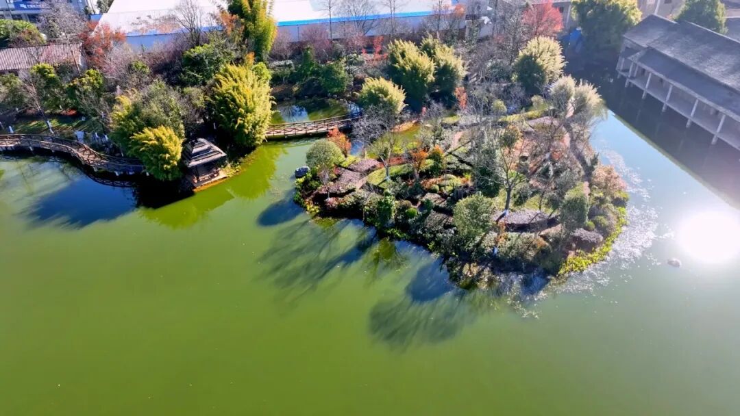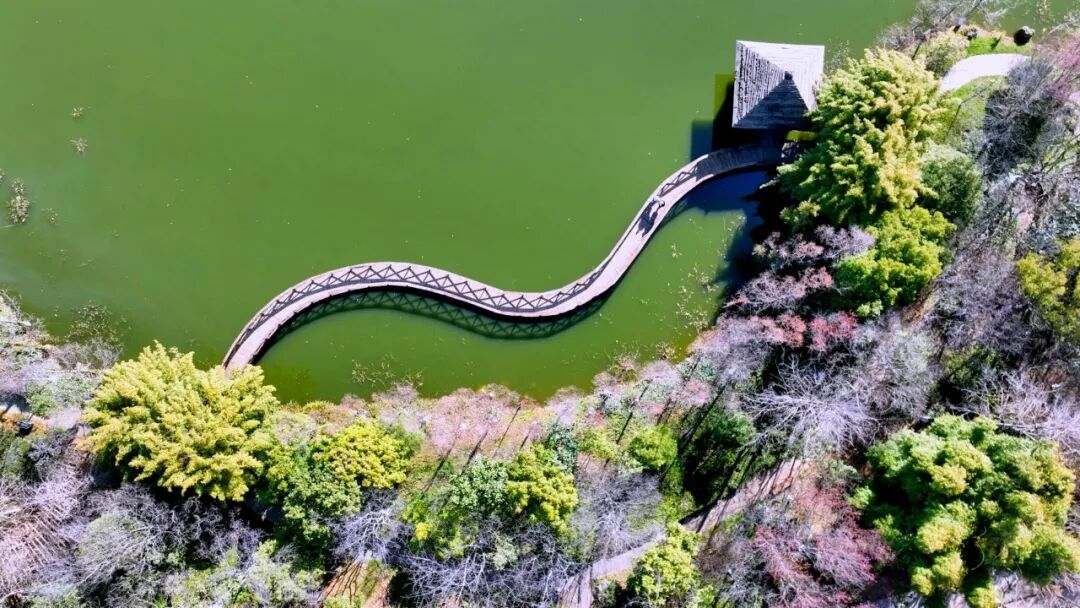 沿湖而行,蜿蜒的水上栈道如一条轻盈的丝带缠绕湖面,将湖光山色串联成景。栈道两端,两列绿竹挺拔而立,枝叶交错缠绕,搭成两道雅致的天然竹拱门,阳光穿过竹叶的缝隙,洒下斑驳陆离的光影。游人缓步其间,仿若置身于画卷之中,步步皆是风景。逛至乏累时,便可到湖畔凉亭小坐,静赏湖光花色,惬意万分。