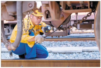 8时15分,雾霭深处传来清脆的金属敲击声,身着明黄色工作服的检车员手持电筒穿梭于货运列车之间,在车底狭窄空间里探查每个零部件、每段风管。