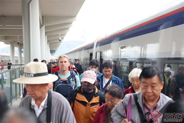 中老铁路磨憨口岸,乘坐D87列次火车入境的中外旅客行走在站台上(摄影:黄远飞)