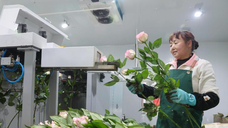 工作人员将花卉放入花卉分级设备中。记者高吴双/摄