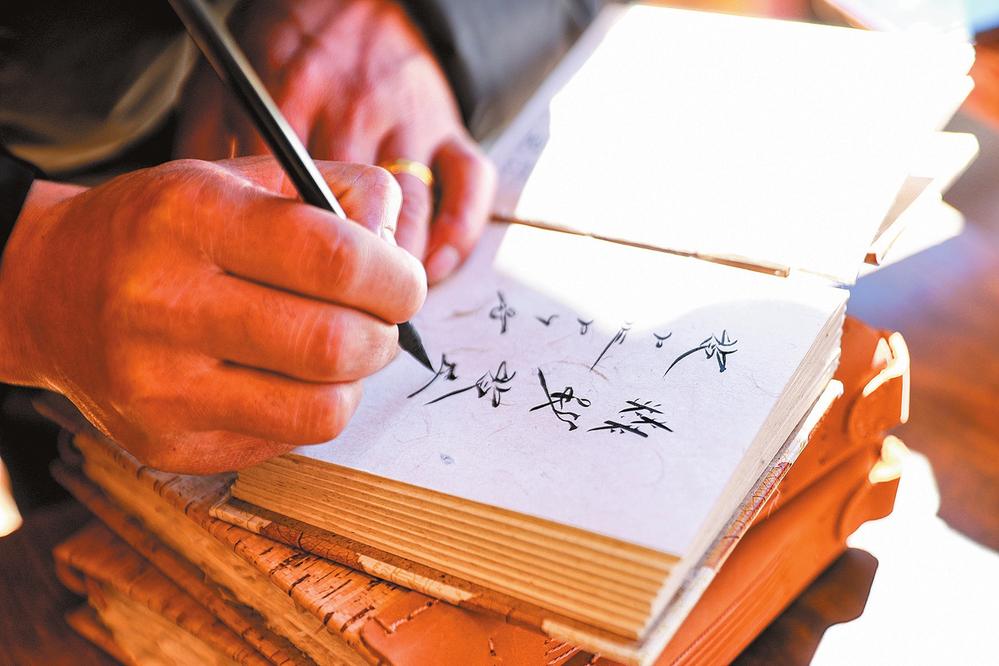 非遗代表性传承人在东巴纸笔记本上为游客手写东巴语祝福。 记者胡妤雅/摄