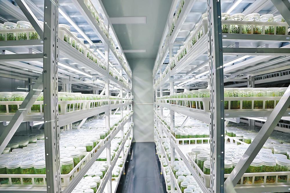 蓝莓幼苗在组培室的无菌环境中生长。