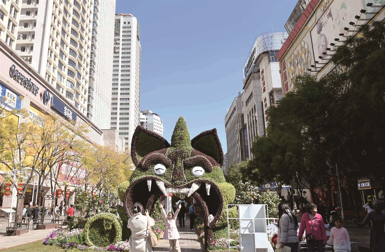 记者在南屏街东段看到,“财猫双全”花艺展将云南非遗与春日繁花巧妙融合。一只由鲜花与绿植精心编织而成的巨型瓦猫拱门,憨态可掬,成为街头最吸睛的景观。