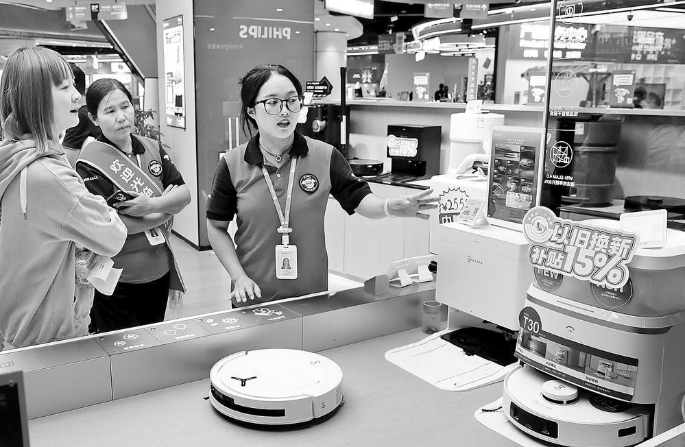 在京东广福路商场,销售人员向顾客介绍“以旧换新”补贴政策。(资料图)春城晚报记者杨峥/摄