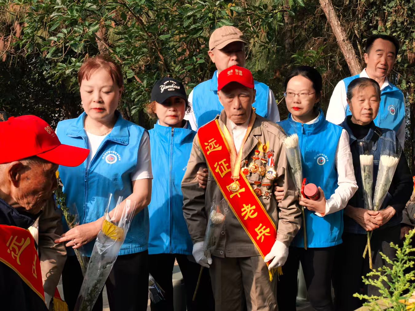4日上午,松山松涛呜咽,哀思绵长,阳光透过枝叶,洒在墓碑上。白发苍苍的老兵们在家人和志愿者的悉心搀扶下,缓缓列队,尽管步履蹒跚、身形佝偻,却依旧挺直脊梁,颤巍巍地举起右手行军礼,目光久久凝视着墓碑上的文字,那眼神里,有思念,有回忆,更有穿越岁月的赤诚。101岁的廖沛林老人声音颤抖、几度哽咽,字句饱含深情:“又是一年春草绿,面对青山祭忠魂。中华儿女世世代代都不会忘记你们,如今的国泰民安,是你们用鲜血和生命换来的,感谢你们!”话音未落,老人已泪湿衣襟,在场众人无不动容。