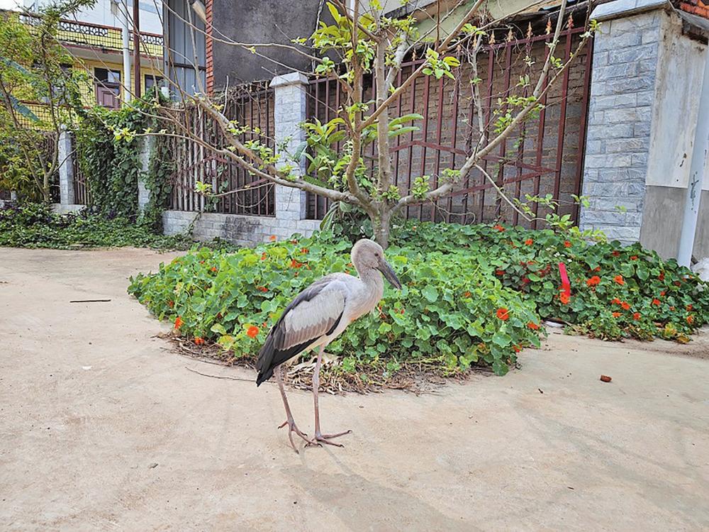 当天上午,林业站工作人员在院内巡查时,发现一只外形独特的大型鸟类。经辨认,该鸟通体灰白、飞羽泛黑,最显著的特征是长着一枚粗壮且闭合时留有明显缺口的钳状巨喙。经辨认,确定其为国家二级保护动物钳嘴鹳。面对工作人员的靠近,这只钳嘴鹳表现得十分温顺,安静地在院内驻足。