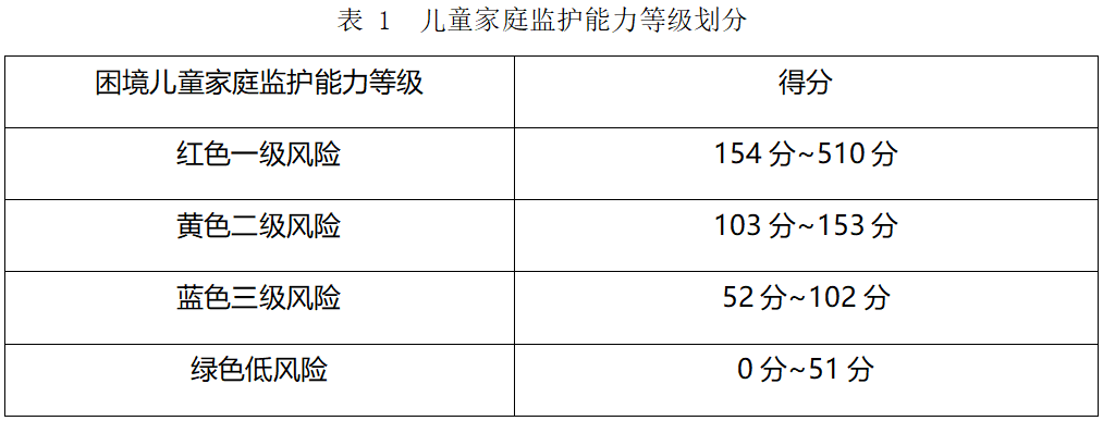 根据计算得分情况,对困境儿童家庭监护能力进行等级划分,分成红色一级风险、黄色二级风险、蓝色三级风险、绿色低风险四个等级(由高到低),如表1所示。父母监护能力、被委托照护人监护能力中存在“一票否决”情形的,直接划定为红色一级风险。