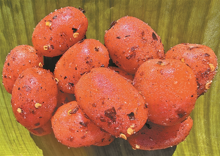 德宏人调理羊奶果的手艺,藏着最地道的边陲风味。生果切片,拌上焙香的糊辣椒、盐巴、香菜,酸爽里裹着辛香,一口便醒神开胃;熟果轻捏即破,清甜汁水满口生津,半熟的果子若与甘蔗红糖同入陶罐腌制几日,开坛时香气能漫过半个院落。最具风情的,当属七分熟羊奶果做的撒苤:舂碎的果肉混上熟牛肉、韭菜、老缅芫荽、香蓼、小米辣,调味拌匀,配上米线、烤肉、生菜蘸食,酸、辣、鲜、香在舌尖层层绽放,这是独属于德宏的季节限定美味。
