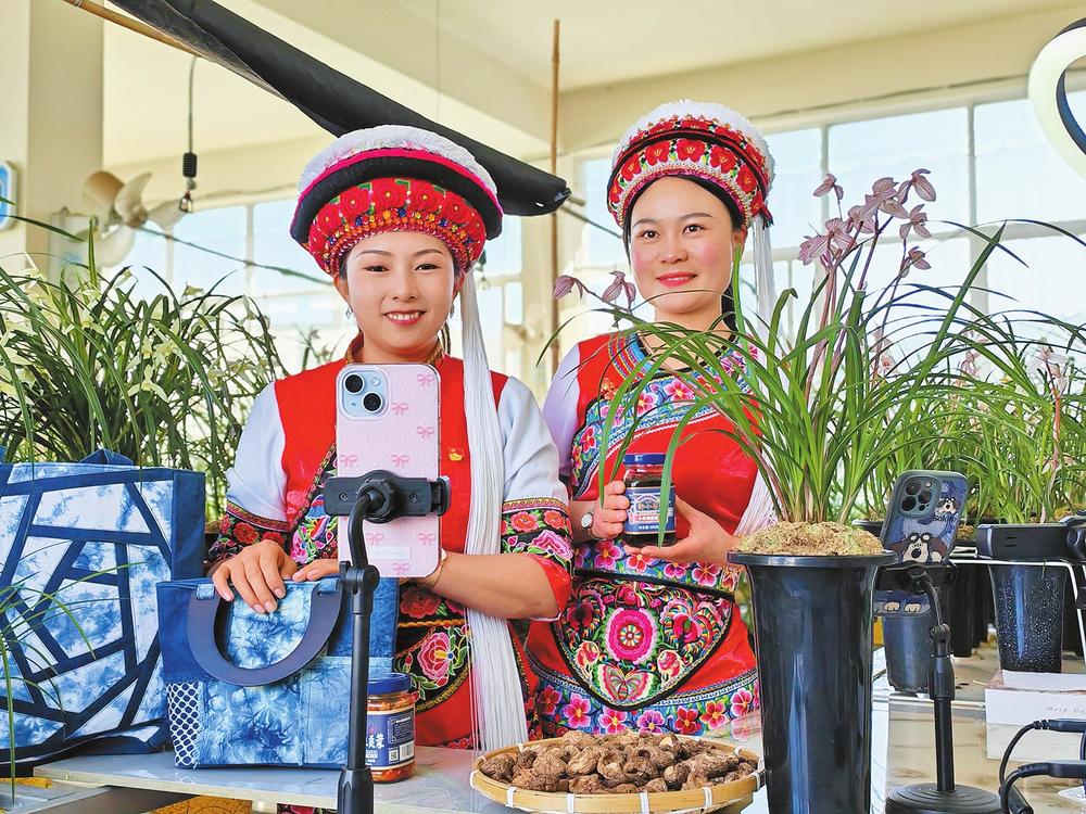 “这是用我们白族传统扎染工艺制成的手包,既有民族风情又时尚百搭。”“我手上的梨膏,选用本地个大味甜的黄梨熬制而成,第一批成品优先给直播间下单的哥哥姐姐发货……”
