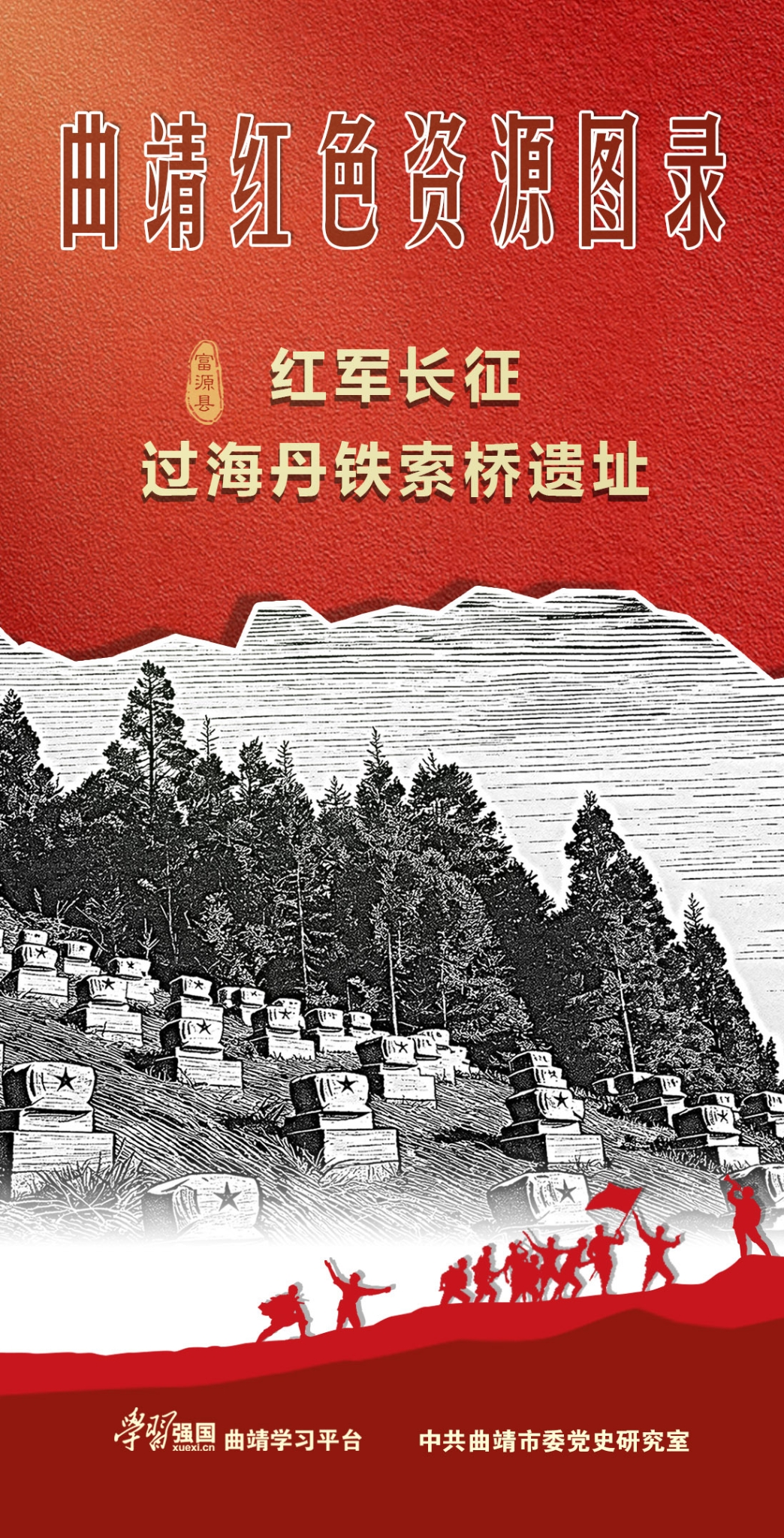 云南曲靖历史悠远、文脉绵长,红色底蕴厚重、革命薪火相传。近代以来,在中国共产党的坚强领导下,曲靖人民奋勇抗争、浴血拼搏,在迤东热土上书写了波澜壮阔的革命篇章,留下了丰富而珍贵的红色资源。为深耕红色沃土、赓续红色血脉,曲靖市委、市政府高度重视红色资源保护、传承与利用,对全市革命遗址进行精准调查,组织编印《曲靖红色资源图录》,集中展现革命遗址的历史价值。“学习强国”曲靖学习平台编辑部制作海报,以各县(市、区)红色资源为单位,将书中内容一一呈现在手机端、PC端,让广大干部群众以更便捷的方式了解曲靖的红色资源,厚植爱国情怀,凝聚奋进力量。